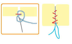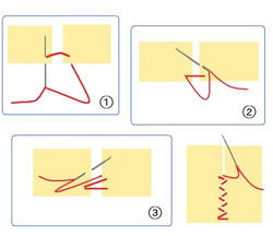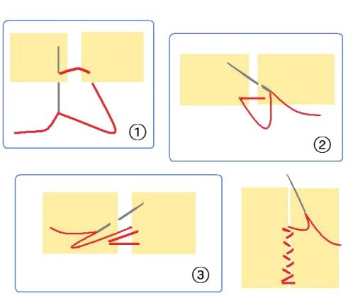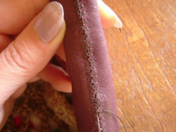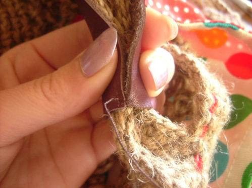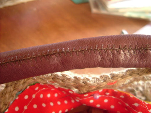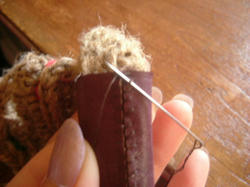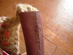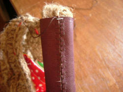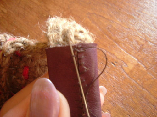 2009/05/01 Category : 作り方:Bag(編み) 麻ひもBag6(持ち手をくるむ) 今回は、最後の 持ち手を革でくるむ やり方を。。。(まだ、内袋をまつっていないのですが。。。 完成図♪ )持った時に革の角が当たらず見ばえもイイかなと、ごく普通の針と太糸(シャッぺ30番)でこんな感じに仕上げてみました。材料 革 5㎝×11㎝ 2枚1.最初は一文字に糸を渡して図のようにかがっていきます。(革の左右の長さがずれていきやすいので揃えながら針を運んで下さいね)最後も、一文字に渡して(白い線の箇所)2.進行方向バックで、かがってきた糸を交合にすくって糸を引きしめます。糸を引き締めながら、一目、一目すくっていきます。。。最後まで戻ったら、一文字の箇所で図のように糸を結び(2回ぐらい)かがった間を五㎝ほどくぐらせて糸を切ります。麻ひもBag おしまい♪最初からの作り方は、カテゴリーの 作り方:麻ひもBagをクリックして見られますので良かったら作って見て下さいネ にほんブログ村[0回]