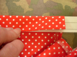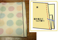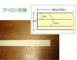2009/04/25 Category : ちょっと技 アイロン定規 昔、洋服のサンプル会社で働いていた時に教えてもらった小道具です。縫い代を折ったりする時に あると便利♪材料 要らないカレンダー(あまり厚みのないものを。。。)作り方図のサイズでカットし 線を引く。おしまい♪ カットする幅と長さは 好みと使いやすさで、ご自由に作ってみて下さいネ。 使い方(2.5㎝幅の三つ折り)布端を 1㎝の線に合わせ、折りながらアイロンをかける。折った端を2.5㎝のへりに合わせ、折りながらアイロンをかけると2.5cm幅の三つ折り完成。 にほんブログ村[0回]