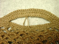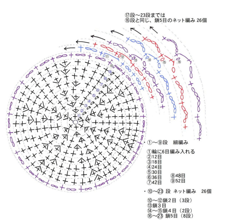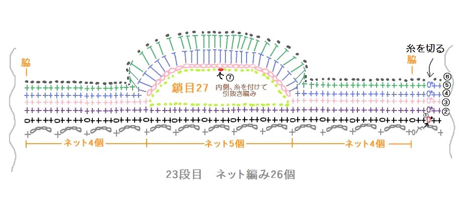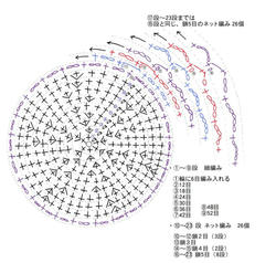 2009/04/14 Category : 作り方:Bag(編み) 麻ひもbagの作り方2 持ち手の編み図、起こしました!片面半分の図になっておりますのでかた一方も繰り返し、ぐるっと編んで下さいネ☆(^-^)(クリックで大きく見られます)ネット編み23段が長編みで終わってからの続き、持ち手部分を編んでいきます。編み図の、赤い色 鎖目からスタート!・1段目は細編み4目と鎖1目でネットを、ぐるっと うめて行きます。・2段目、細編み・3段目で、持ち手の土台になる部分を編んでいきます。 細編みを途中まで編んで鎖編み27目作ります。又、細編みに戻って、繰り返し 2本の鎖編みの持ち手土台を作り3段目終わりまで。。。。・4段目、細編みから持ち手の鎖目に中長編みを編みます。・5段目 細編みと中長編み・6段目 引き抜き編みで糸を切ります。つぎは、内側に糸を付け、ぐるっと引き抜き編みします。これで、バッグが編み上がりました☆あとは、とじ針で糸の始末を。。。。次は、バッグチャームをUPいたします☆♪(^-^) にほんブログ村[1回]