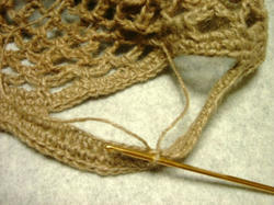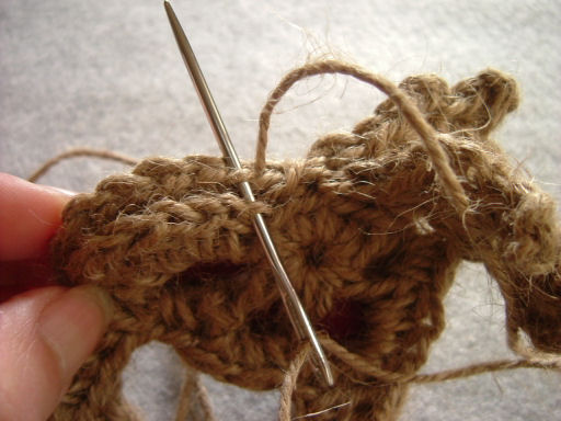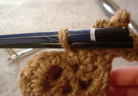 2009/04/20 Category : 作り方:小物(編み) bagチャームの作り方2 モチーフを2枚編み終わったら。。。2. 一枚の裏面に木工用ボンドを塗り ハギレを貼る。3.2枚を合わせ、残り糸でとじて行きます。1周してとじ終わりました。4.ループを作ってかがって行きます。そのままの糸で2回刺し、鉛筆2本ほどの大きさのループを作ります。かがり方図①ループに針を入れる②出来た輪に針を入れる③糸を引っ張る。①~③を繰り返しループにかがって行く5.ループ完成。続く。。 ひもを作る にほんブログ村[1回]PR
