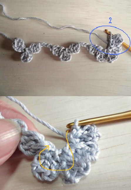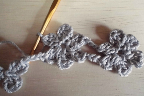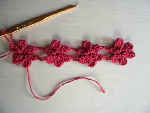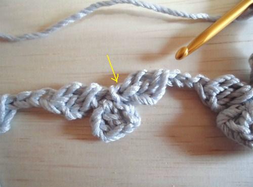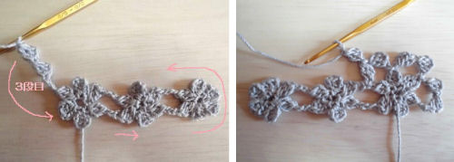 (3)続いて繋ぎの鎖3目を編み、次の花に移ります。編み入れる箇所は