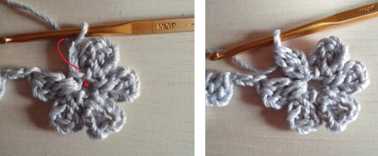 (6)最後の花は下段の鎖目1本に引き抜いて6枚目の花びらを編んで下さい。