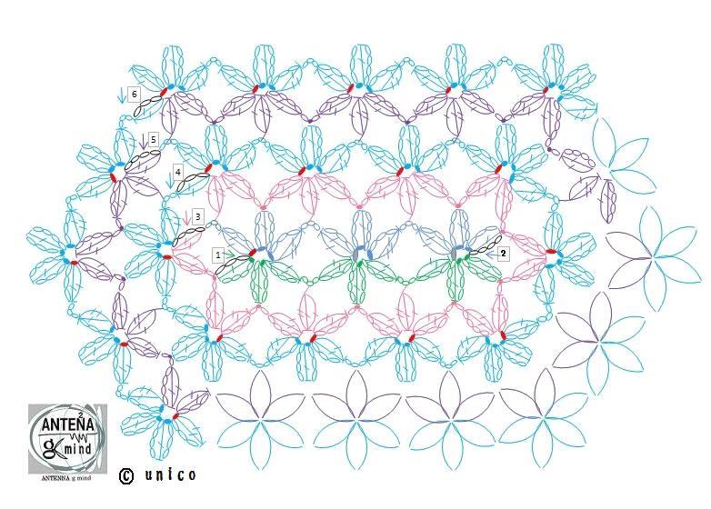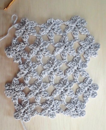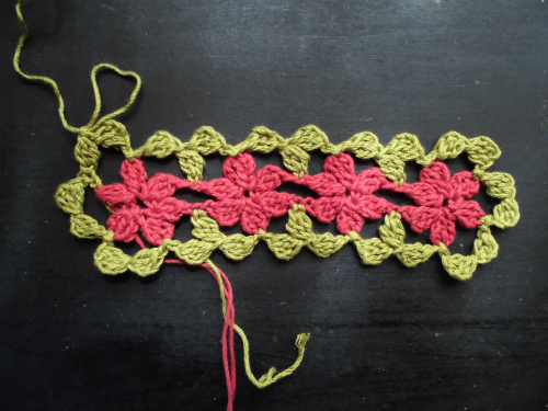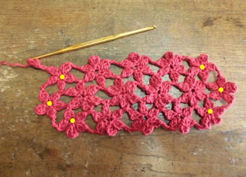 編み図では3つのお花でスタートしていますが、間に増やせば