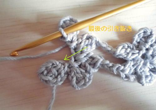 下段の鎖目 裏山に引き抜きます。(灰色編目記号)