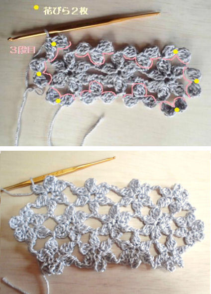 2段目上段の花の編みつけ箇所が、3段目~と編目の出方が異なっている