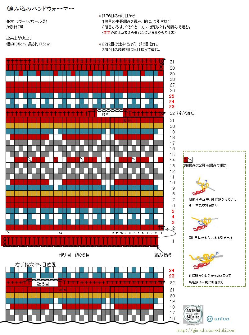 中央の柄、模様の編み図は同じですが糸を替えるタイミングが